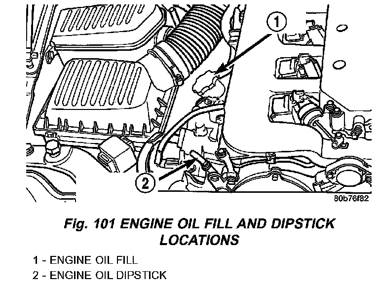 Checking the oil while the vehicle is on level ground will improve the accuracy of the oil level reading (Fig. 101). Add only when the level is at or below the ADD mark.