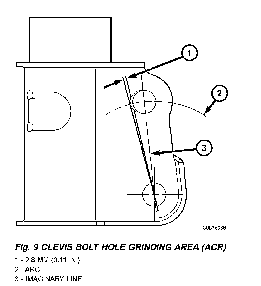 5. Draw an imaginary line from the center of the clevis bracket upper bolt hole down through the center of the clevis bracket lower bolt hole. Pivoting the line at the center of the lower hole, move the upper end of the line inward so as to follow an arc past the inner edge of the upper bolt hole approximately 2.8 mm (0.11 inch). Mark the bracket showing what area of the surface needs to be removed to form the elongated hole. Remember, this elongation must follow the arc. Repeat this step on the opposite side of the clevis bracket.