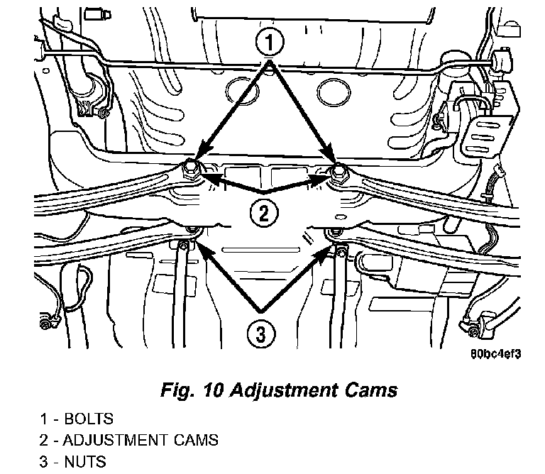 CAUTION: When adjusting rear toe, the notches on the toe adjustment cams are not to be facing down. The notches in the adjustment cams are only to be facing up or toward one side.