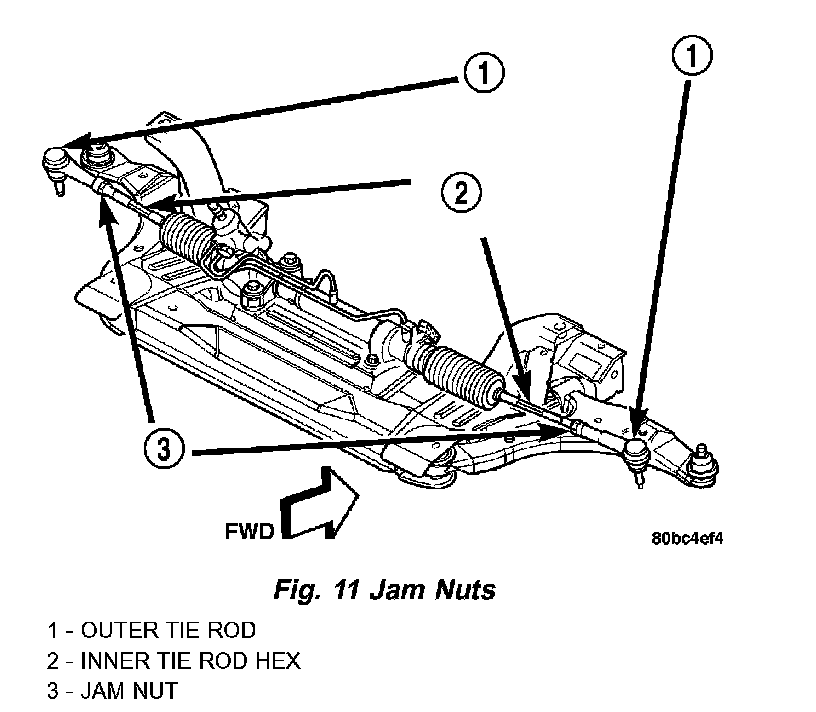1. Loosen the tie rod adjusting jam nuts. Grasp each inner tie rod at its hex and rotate it one way or the other until the front wheel toe is set to the preferred specification.