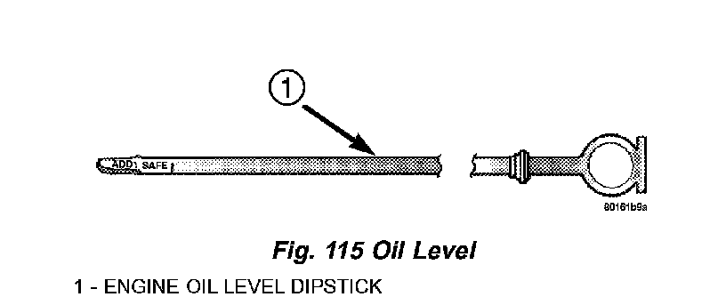 ENGINE OIL LEVEL CHECKThe best time to check engine oil level is after it has sat overnight, or if the engine has been running, allow the engine to be shut off for at least 5 minutes before checking oil level. Checking the oil while the vehicle is on level ground will improve the accuracy of the oil level reading. Remove dipstick (Fig. 114) and observe oil level. Add oil only when the level is at or below the ADD mark (Fig. 115).