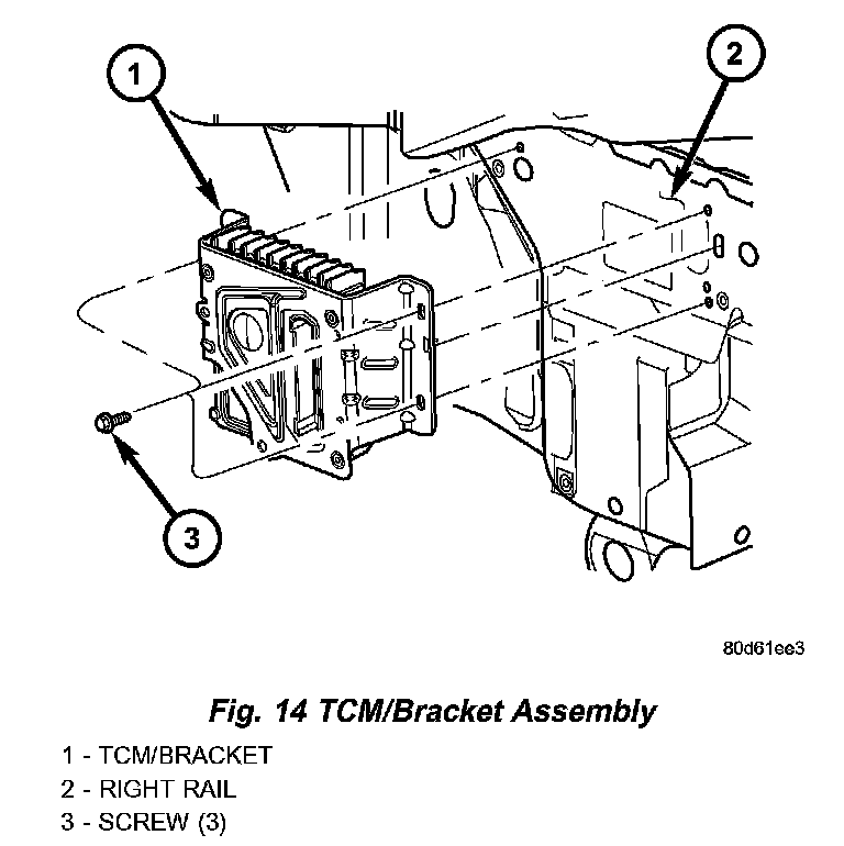 5. Remove three (3) TCM bracket-to-rail screws and remove TCM/bracket assembly from vehicle (Fig. 14).