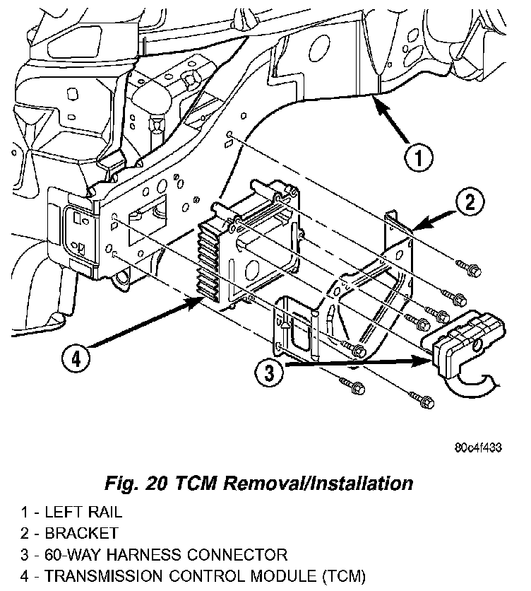 REMOVALNOTE: If the transmission control module (TCM) is being replaced with a new or replacement unit, the Pinion Factor and Quick Learn procedures must be performed. (Refer to ELECTRICAL/ELECTRONIC CONTROL MODULES/TRANSMISSION CONTROL MODULE/STANDARD PROCEDURE/PINION FACTOR PROCEDURE)(Refer to ELECTRICAL/ELECTRONIC CONTROL MODULES/STANDARD PROCEDURE/QUICK LEARN PROCEDURE)