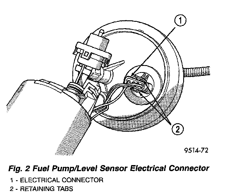 1. Depress retaining tab and remove the fuel pump/level sensor connector from the BOTTOM of the fuel pump module electrical connector.