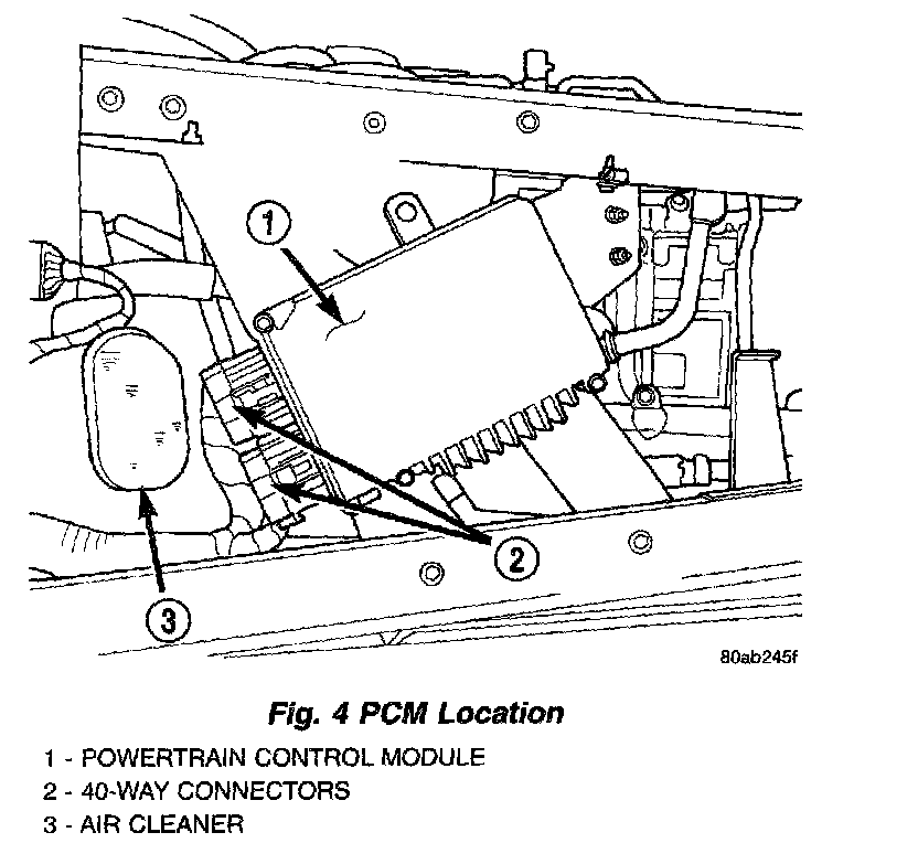 REMOVALThe PCM engine control strategy prevents reduced idle speeds until after the engine operates for 320 km (200 miles). If the PCM is replaced after 320 km (200 miles) of usage, update the mileage and Vehicle Identification Number (VIN) in the new PCM. Use the DRB scan tool to change the mileage and VIN in the PCM. If this step is not done a Diagnostic Trouble Code (DTC) may be set. Refer to the appropriate Powertrain Diagnostic Manual and the DRB scan tool.
