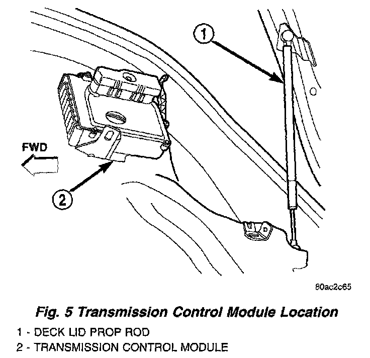 The Transmission Control Module is located in the trunk compartment on the right side of the vehicle. It is held in place by four mounting screws (Fig. 5).