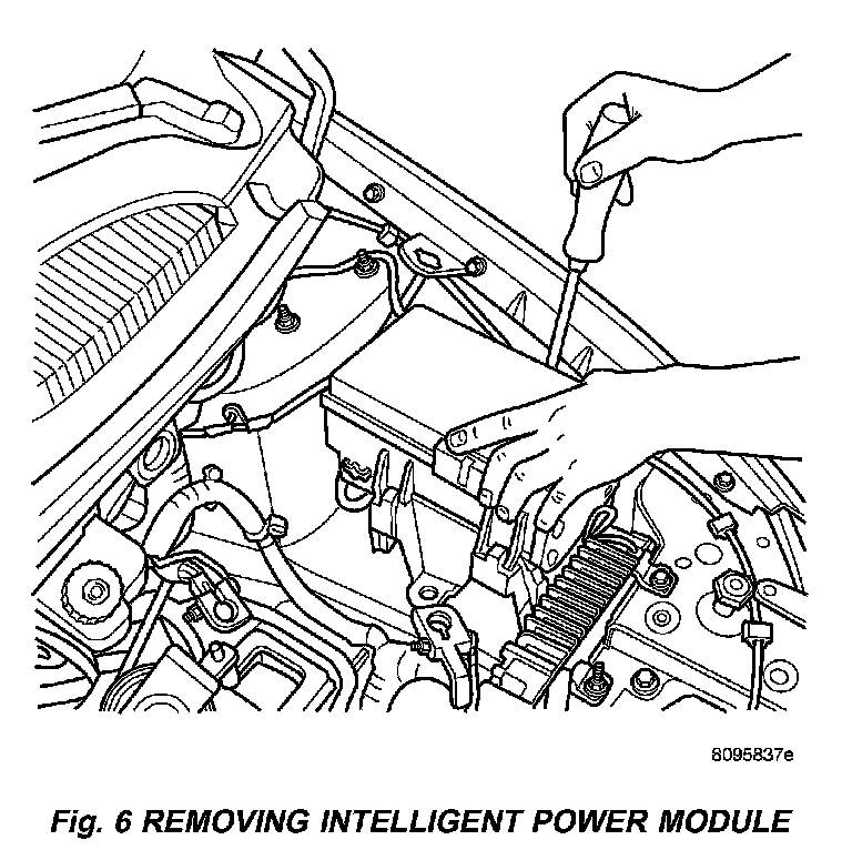 3. Using a long flat-bladed screwdriver, gently twist the Integrated Power Module (IPM) retaining clip outboard to free the IPM from its mounting bracket (Fig. 6). Rotate IPM upward to access the Front Control Module (FCM) retaining screws.