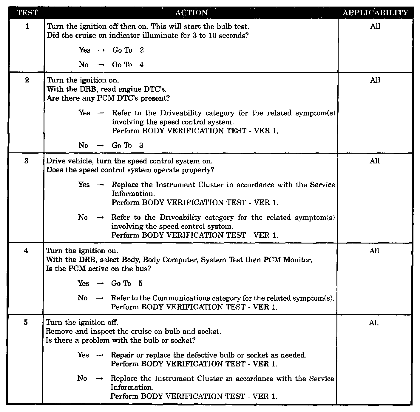 Home >> Chrysler >> 2003 >> Intrepid (CANADA) V6-2.7L >> Repair and Diagnosis >> Powertrain Management >> Computers and Control Systems >> Body Control Module >> Testing and Inspection >> Symptom Related Diagnostic Procedures >> Cruise on Indicator Not Operating Properly