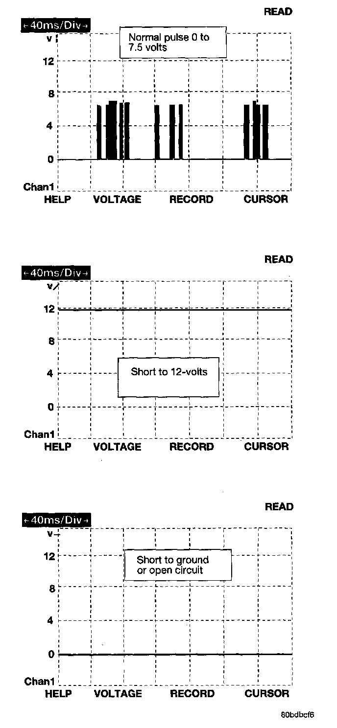 The bus messages are transmitted at a rate averaging 10,800 bits per second. Since there is only voltage present when the modules transmit and the message length is only about 500 milliseconds, it is ineffective to try and measure the bus activity with a conventional voltmeter. The preferred method is to use the DRBIII (R) lab scope. The 12 V square wave selection on the 20-volt scale provides a good view of the bus activity. Voltage on the bus should pulse between zero and about seven and a half volts. Refer to the diagram for some typical displays.