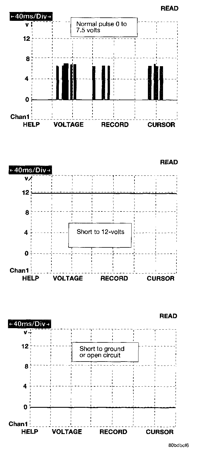 The bus messages are transmitted at a rate averaging 10800 bits per second. Since there is only voltage present when the modules transmit and the message length is only about 500 milliseconds, it is ineffective to try and measure the bus activity with a conventional voltmeter. The preferred method is to use the DRBIII(R) lab scope. The 12v square wave selection on the 20-volt scale provides a good view of the bus activity. Voltage on the bus should pulse between zero and about 7 1/2 volts. Refer to the following figure for some typical displays.