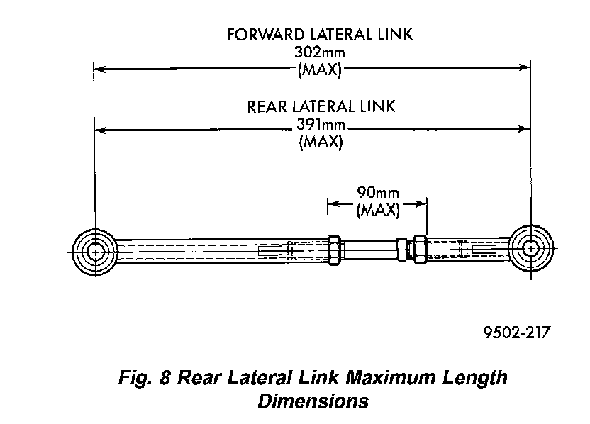 CAUTION: When setting rear camber and toe on the vehicle, the maximum lengths of the adjustable lateral link at the locations shown (Fig. 8) must not be exceeded. If these maximum lengths are exceeded, inadequate retention of adjustment link to the inner and outer link may result.