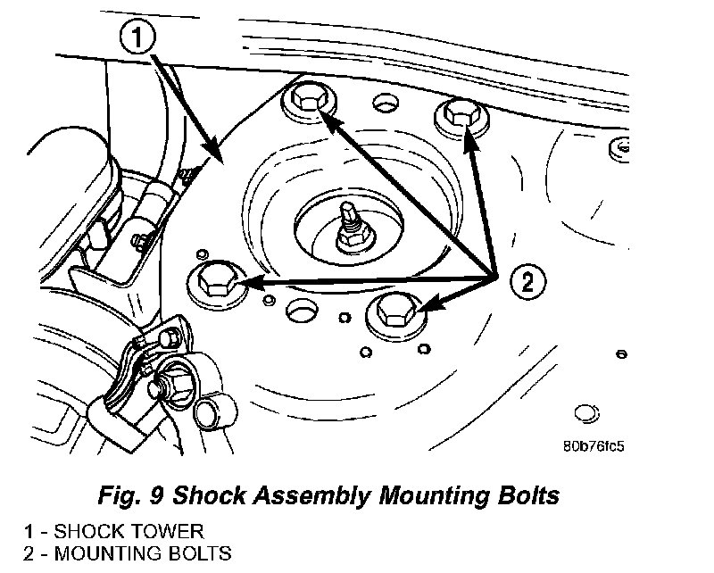 1. Open the hood and mark the position of all four shock assembly mounting bolts on the shock tower (Fig. 9) on the side of the vehicle requiring front camber adjustment.