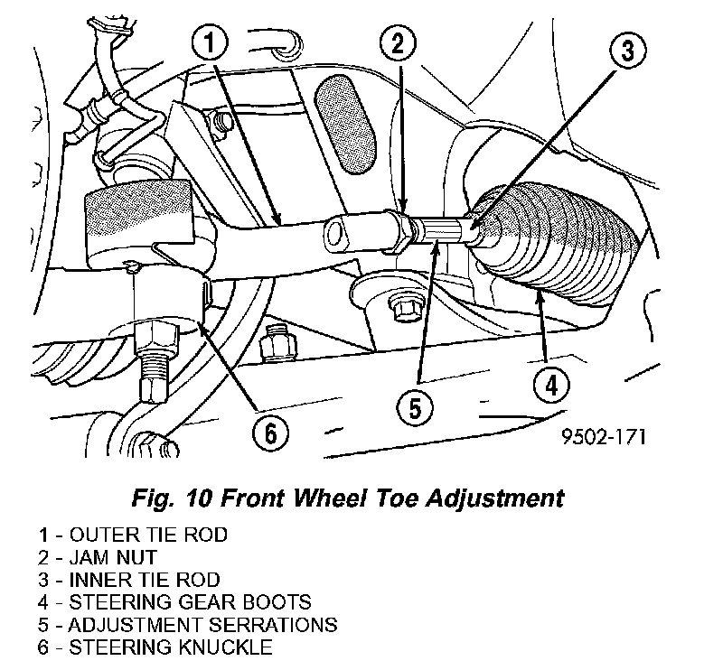 2. Loosen front inner to outer tie rod end jam nuts (Fig. 10). Grasp inner tie rods at serrations and rotate inner tie rods of steering gear to set front toe to the preferred toe specification.