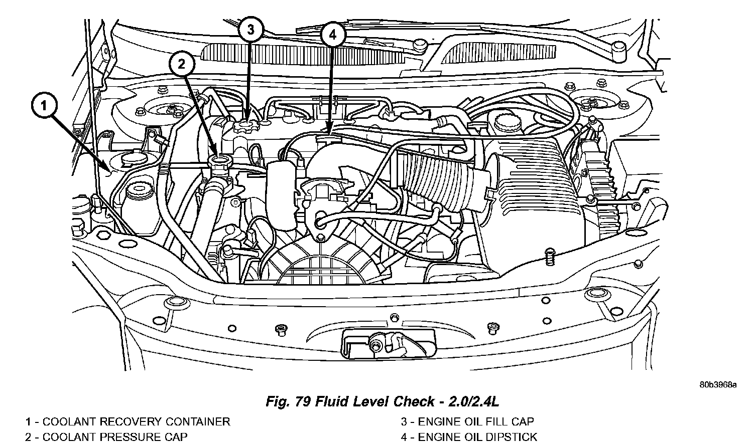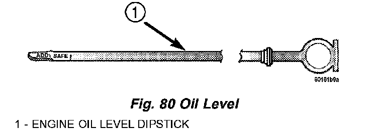STANDARD PROCEDURE ENGINE OIL LEVEL CHECKThe best time to check engine oil level is after it has sat overnight, or if the engine has been running, allow the engine to be shut off for at least 5 minutes before checking oil level. Checking the oil while the vehicle is on level ground will improve the accuracy of the oil level reading. Remove dipstick and observe oil level (Fig. 79). Add oil only when the level is at or below the ADD mark (Fig. 80).