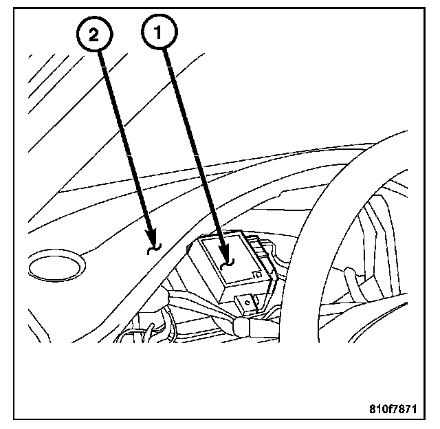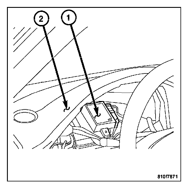 The Sentry Key Remote Entry Module (SKREEM) (1) is located underneath the top pad of the instrument panel (2) behind the Instrument Cluster. The SKREEM works in conjunction with the vehicle locking/unlocking remote control and the Central Locking Pump/Security System Module to lock and unlock the vehicle.
