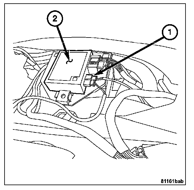 2. Install the sentry key antenna ring electrical connector (1) to the sentry key remote entry module (2).