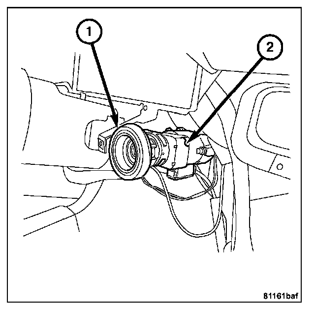 1. Install the sentry key antenna ring (1) to the ignition switch key cylinder (2).