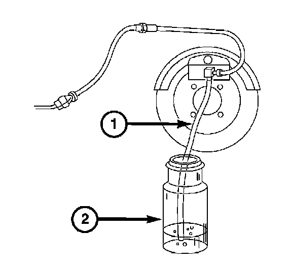 3. Attach one end of the bleed hose (1) to the bleed screw and insert the opposite end in a glass container (2) partially filled with brake fluid. Be sure the end of the bleed hose is immersed in the brake fluid.
