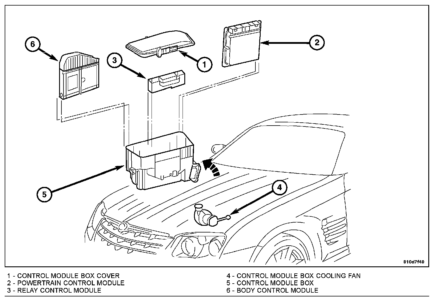 3. Holding the metal powertrain control module retaining clip back, pull the powertrain control module (2) up and out of the control module box (5).