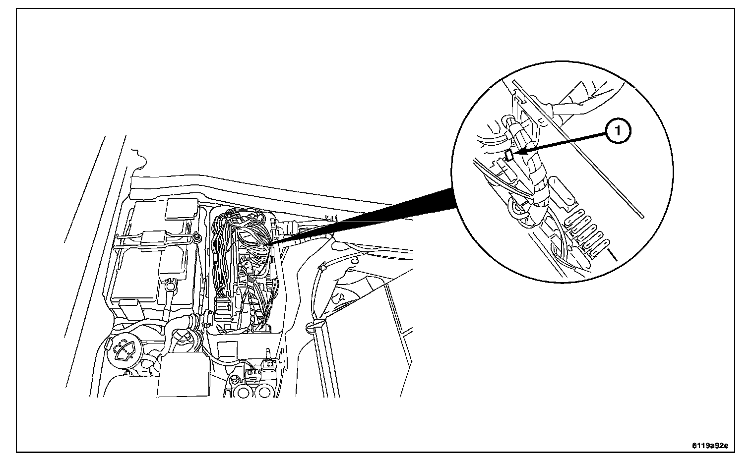 3. Move the wires away to the side of the box to access the clip (1) that holds the relay control module in the control module box.