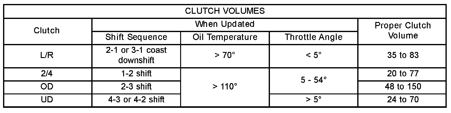 Certain mechanical problems within the clutch assemblies (broken return springs, out of position snap rings, excessive clutch pack clearance, improper assembly, etc.) can cause inadequate or out-of-range clutch volumes. Also, defective Input/Output Speed Sensors and wiring can cause these conditions. The following chart identifies the appropriate clutch volumes and when they are monitored/updated: