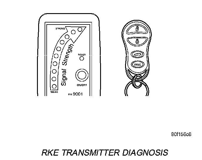 Using special tool 9001, first test to ensure that the transmitter is functioning. Typical testing distance is 2.5 centimeters (1 inch) for Asian transmitters and 30.5 centimeters (12 inches) for all others. To test, position the transmitter as shown. Press any transmitter button, then test each button individually. The tool will beep if a radio signal strength that lights five or more LED's is detected. Repeat this test three times. If transmitter fails any of the test refer to the Diagnostic Procedures manual.