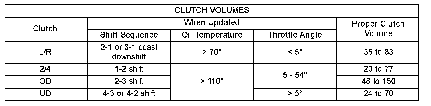 Certain mechanical problems within the clutch assemblies (broken return springs, out of position snap rings, excessive clutch pack clearance, improper assembly, etc.) can cause inadequate or out-of-range clutch volumes. Also, defective Input/Output Speed Sensors and wiring can cause these conditions. The following chart identifies the appropriate clutch volumes and when they are monitored/updated.