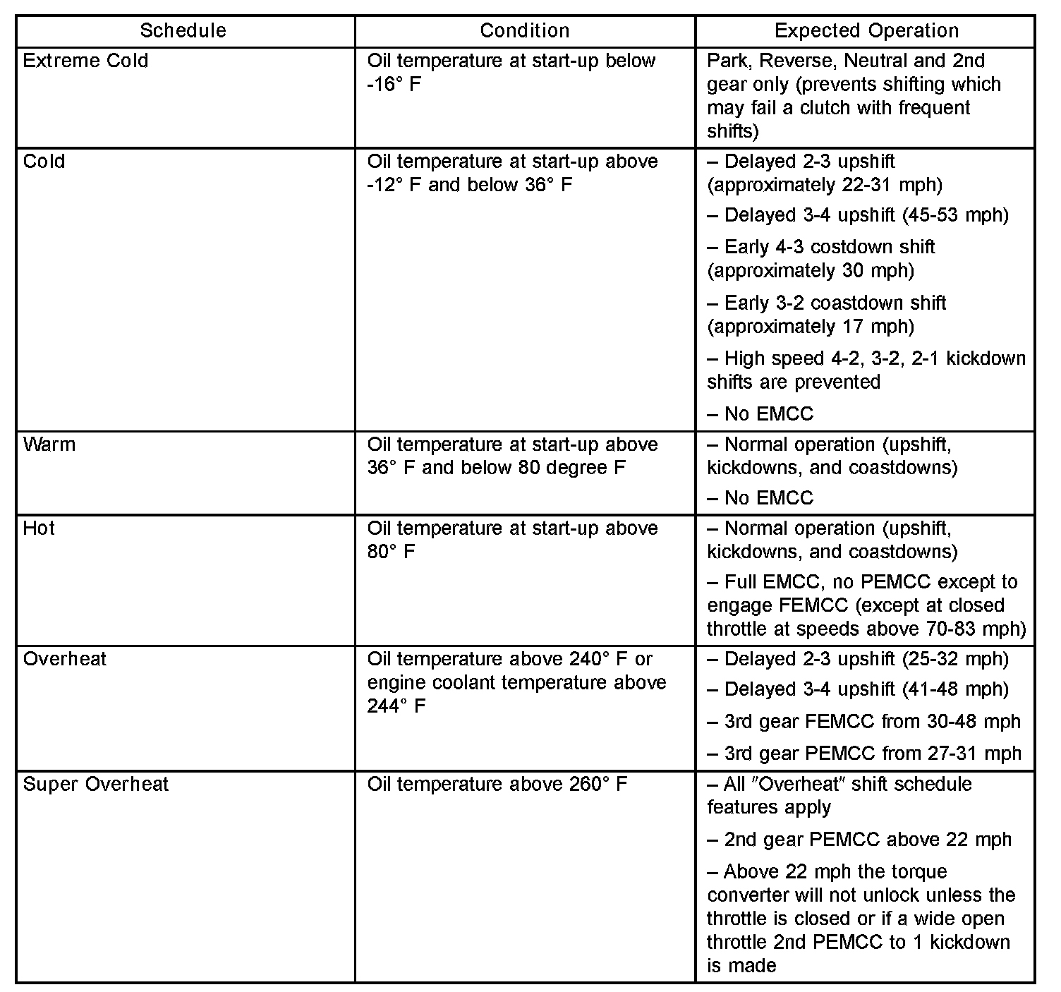As driving conditions change, the PCM appropriately adjusts the shift schedule. Refer to the following chart to determine the appropriate operation expected, depending on driving conditions.