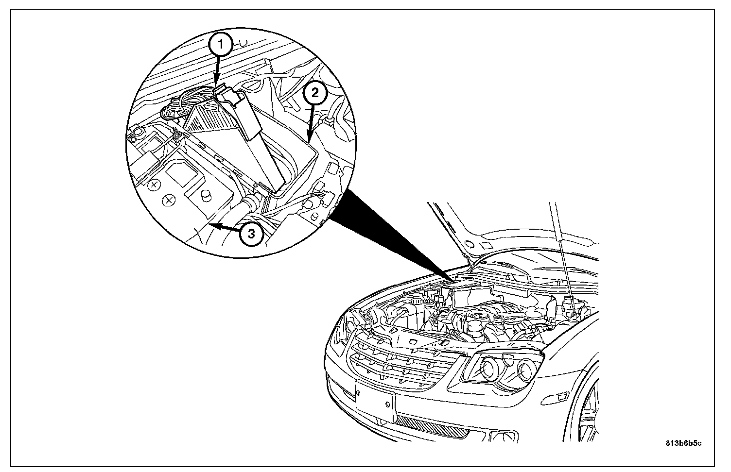 The Body Control Module (BCM) (1) is concealed in the engine compartment inside of the Control Module Box (2) located next to the battery (3).