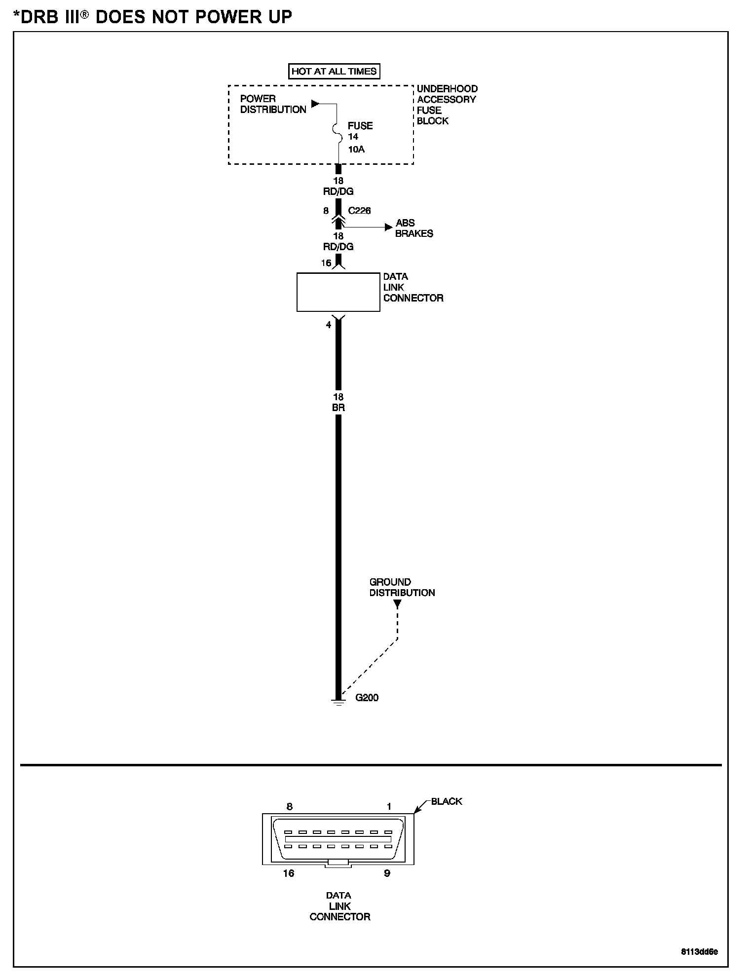 NOTE: If the LEDs do not light or no sound is emitted at start up, check for loose cable connections or a bad cable. Check the vehicle battery voltage (data link 16-way connector cavity 16). A minimum of 11 volts is required to adequately power the DRB III(R). Check for a proper ground at DLC cavity 4. If all connections. are proper between the DRB III(R) and the vehicle or other devices and the vehicle battery is fully charged, an inoperative DRB III(R) may be the result of a faulty cable.