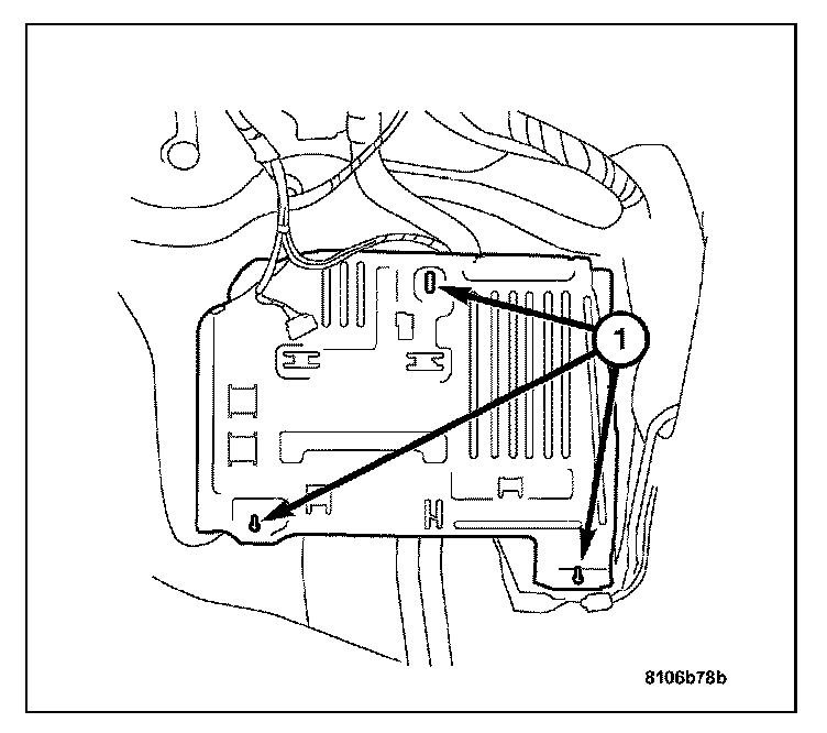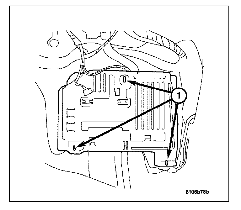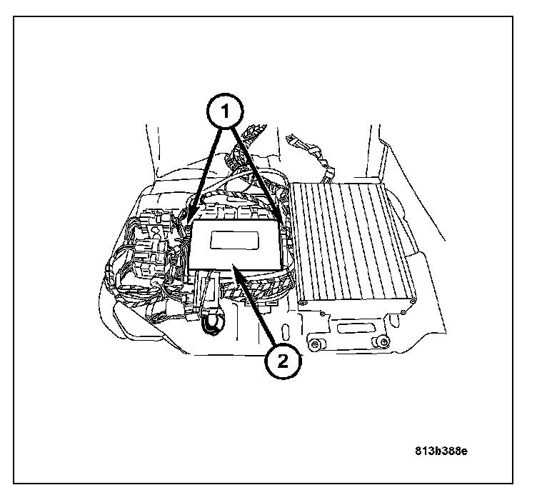 1. Connect the TCM harness connectors and attach the TCM (2) to the base plate with the two retaining screws (1).