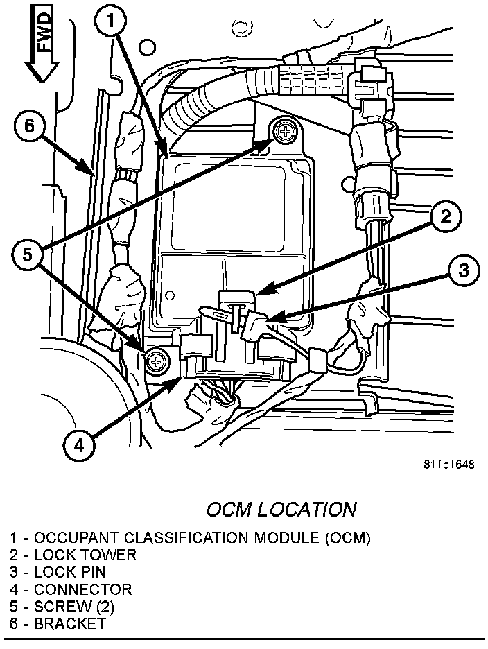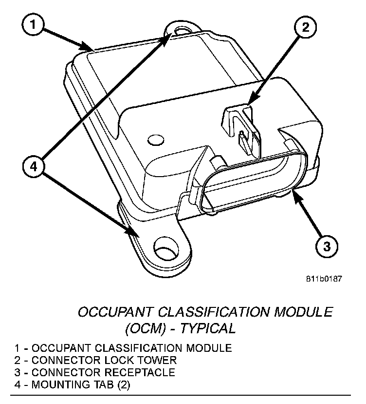 A non-calibrated OCM is the only component of the Occupant Classification System (OCS) that is available for separate service replacement. The OCS components of the passenger side front seat cushion including the cushion frame, insulator pad, seat weight bladder and pressure sensor, seat cushion foam, wiring harness and the OCM are a factory-calibrated and assembled unit. Once this unit is connected to a vehicle electrically, the calibration settings are uploaded from the calibrated OCM and stored in the memory of the Occupant Restraint Con- troller (ORC). If only the OCM is subsequently replaced, the new, non-calibrated OCM learns the proper calibration settings from the ORC after it is connected to the vehicle electrically.