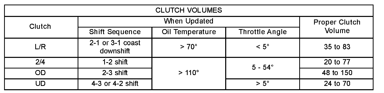 Certain mechanical problems within the clutch assemblies (broken return springs, out of position snap rings, excessive clutch pack clearance, improper assembly, etc.) can cause inadequate or out-of-range clutch volumes. Also, defective Input/Output Speed Sensors and wiring can cause these conditions. The chart identifies the appropriate clutch volumes and when they are monitored/updated.