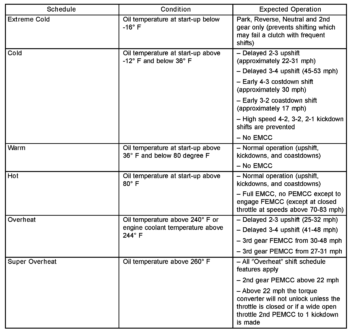 As driving conditions change, the PCM appropriately adjusts the shift schedule. Refer to the following chart to determine the appropriate operation expected, depending on driving conditions.
