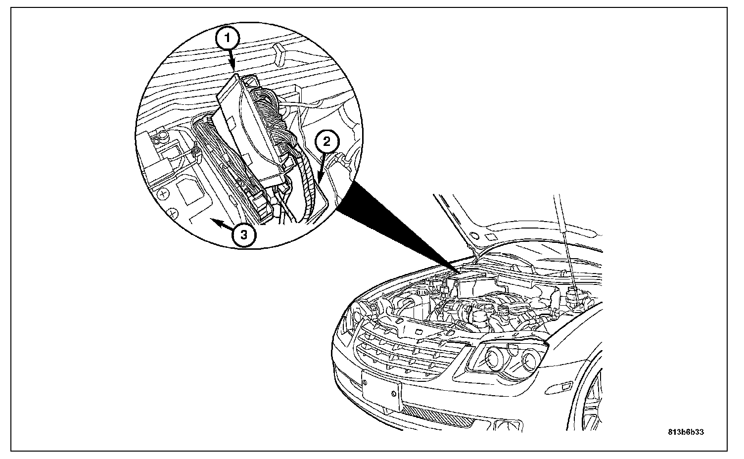 The Powertrain Control Module (1) is concealed in the engine compartment inside the Control Module Box (2) located next to the Battery (3).