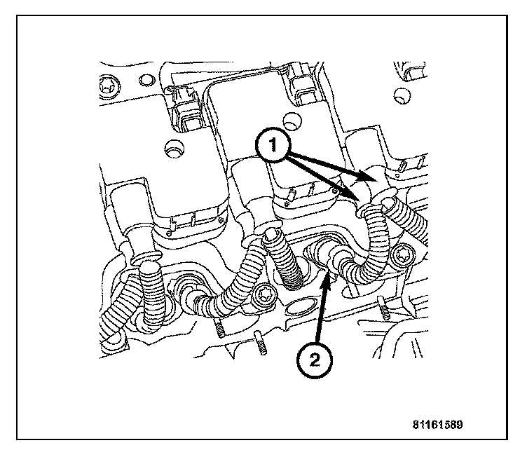 2. Clean the cylinder head spark plug recesses (2) using low pressure compressed air.