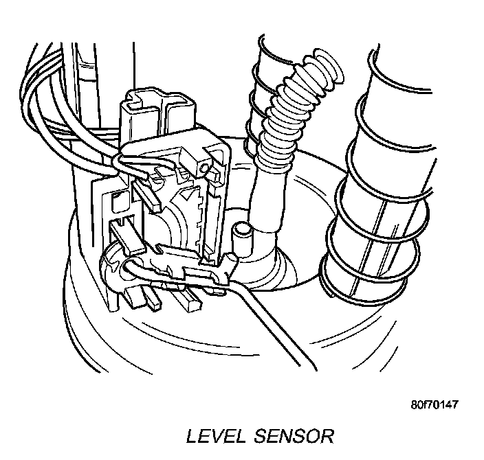 1. Depress retaining tab and remove the fuel pump/level sensor connector from the bottom of the fuel pump module electrical connector.