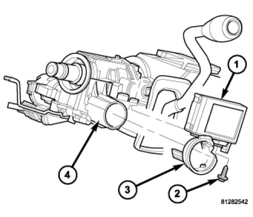 1. Position the Sentry Key REmote Entry Module (SKREEM) (1) onto the steering column with the antenna ring (3) oriented around the ignition lock cylinder housing (4).