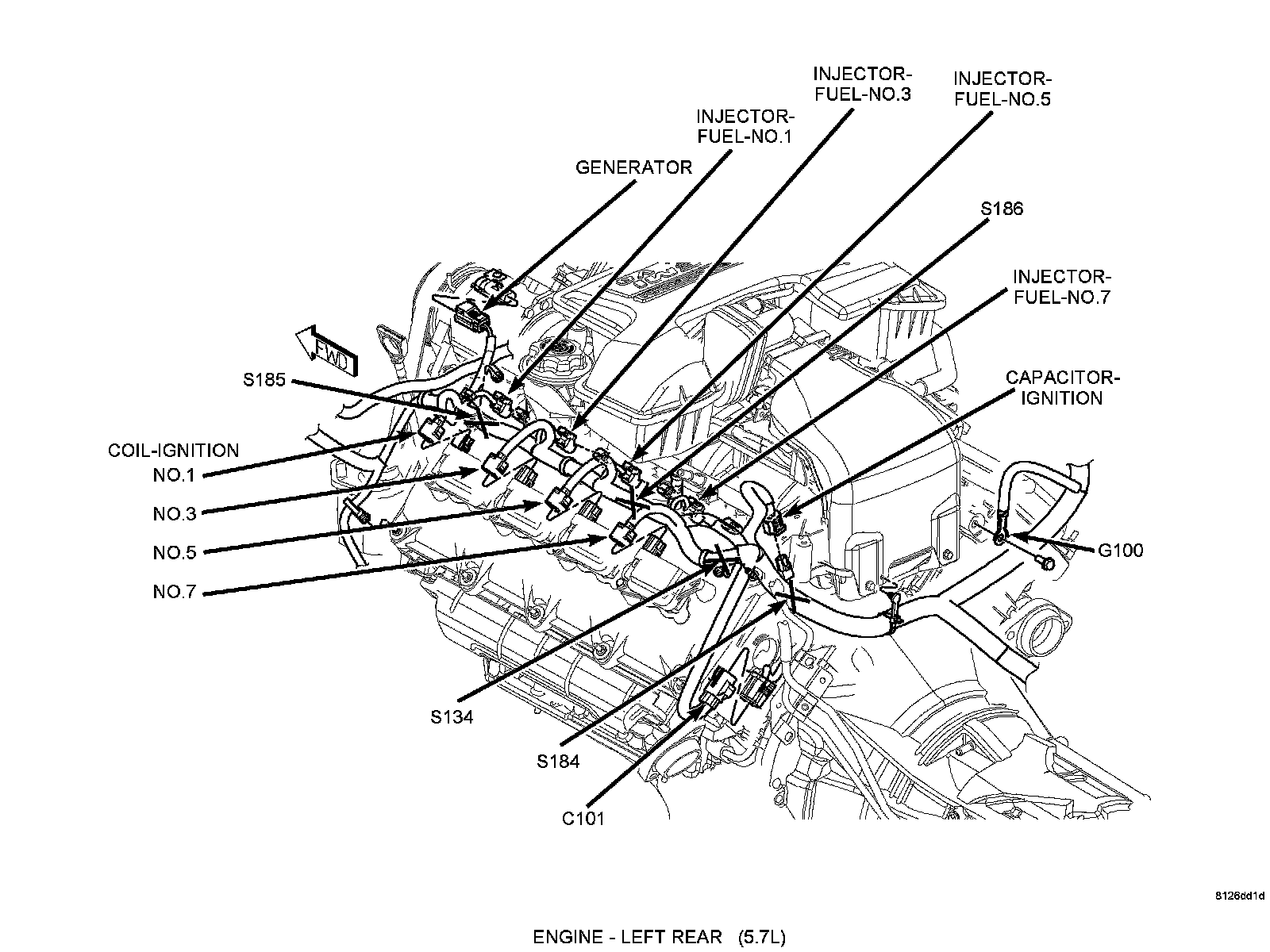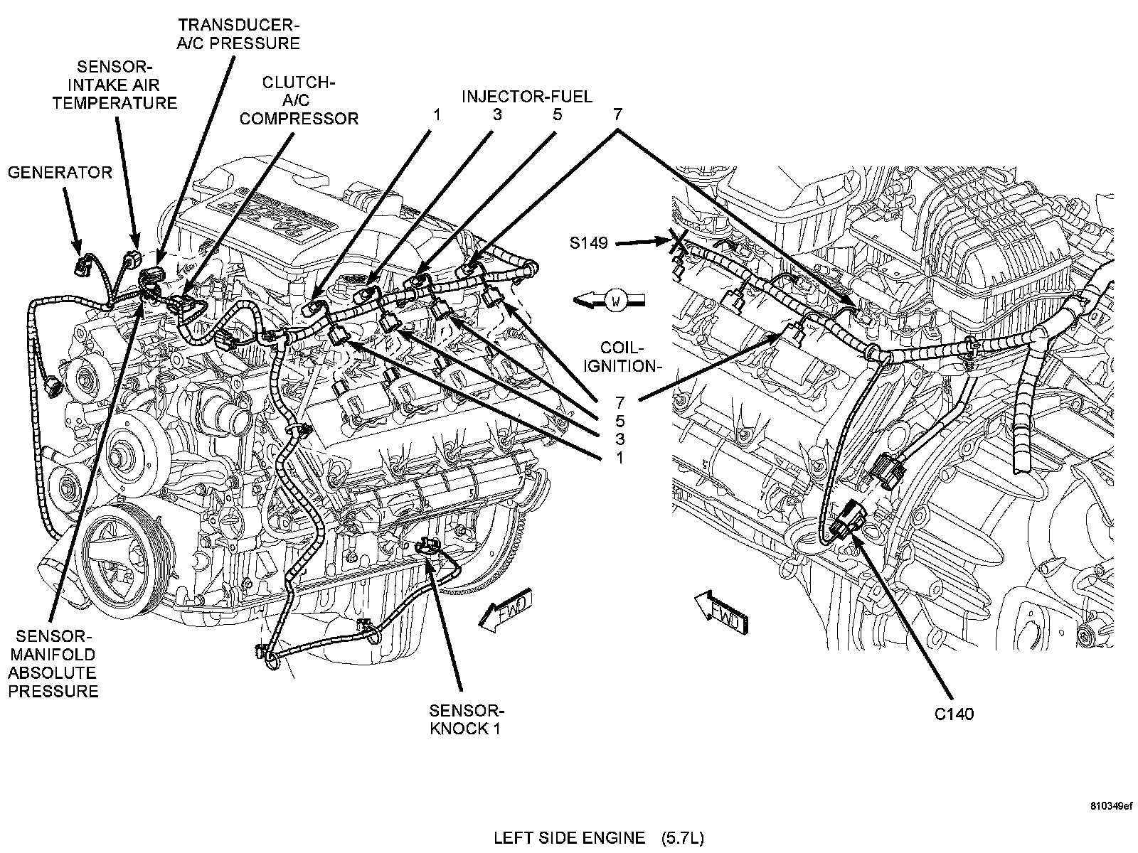The 5.7L engine (345 CID) eight-cylinder engine is a 90° V-Type lightweight, deep skirt cast iron block, aluminum heads, single cam, overhead valve engine with hydraulic roller tappets. The heads incorporate splayed valves with a hemispherical style combustion chamber and dual spark plugs. The cylinders are numbered from front to rear; 1, 3, 5, 7 on the left bank and 2, 4, 6, 8 on the right bank. The firing order is 1-8-4-3-6-5-7-2.