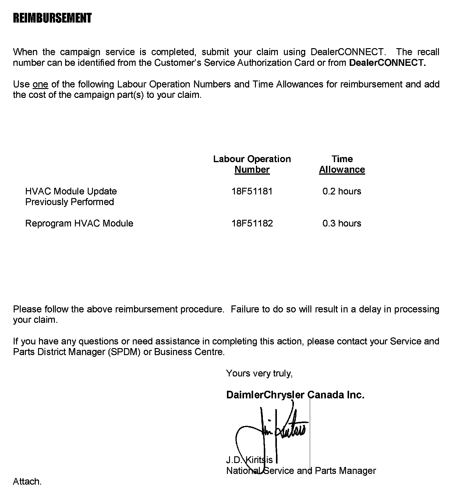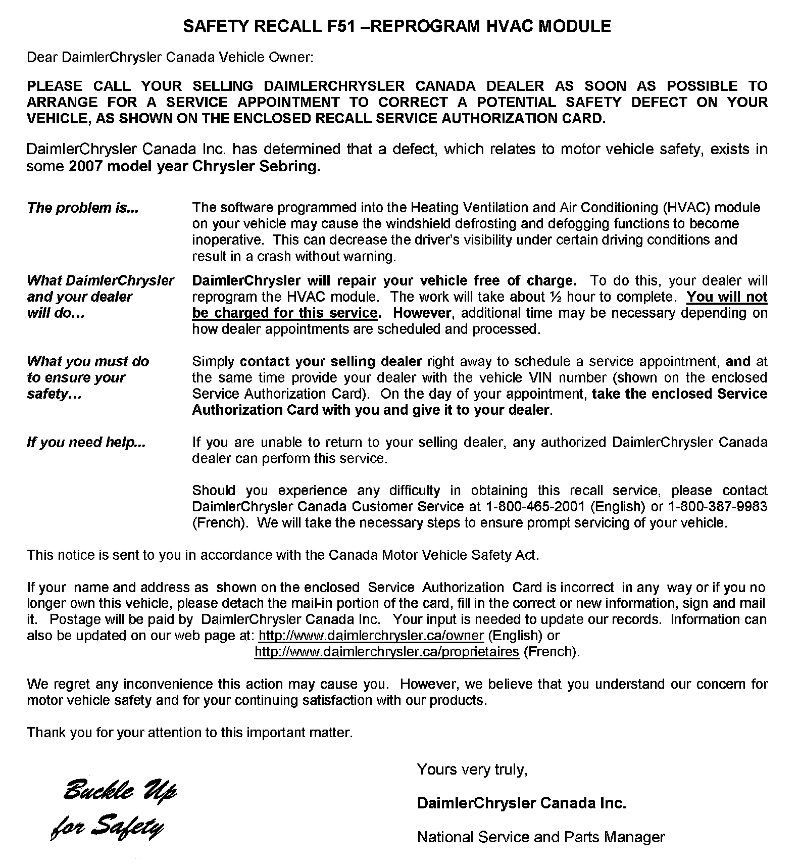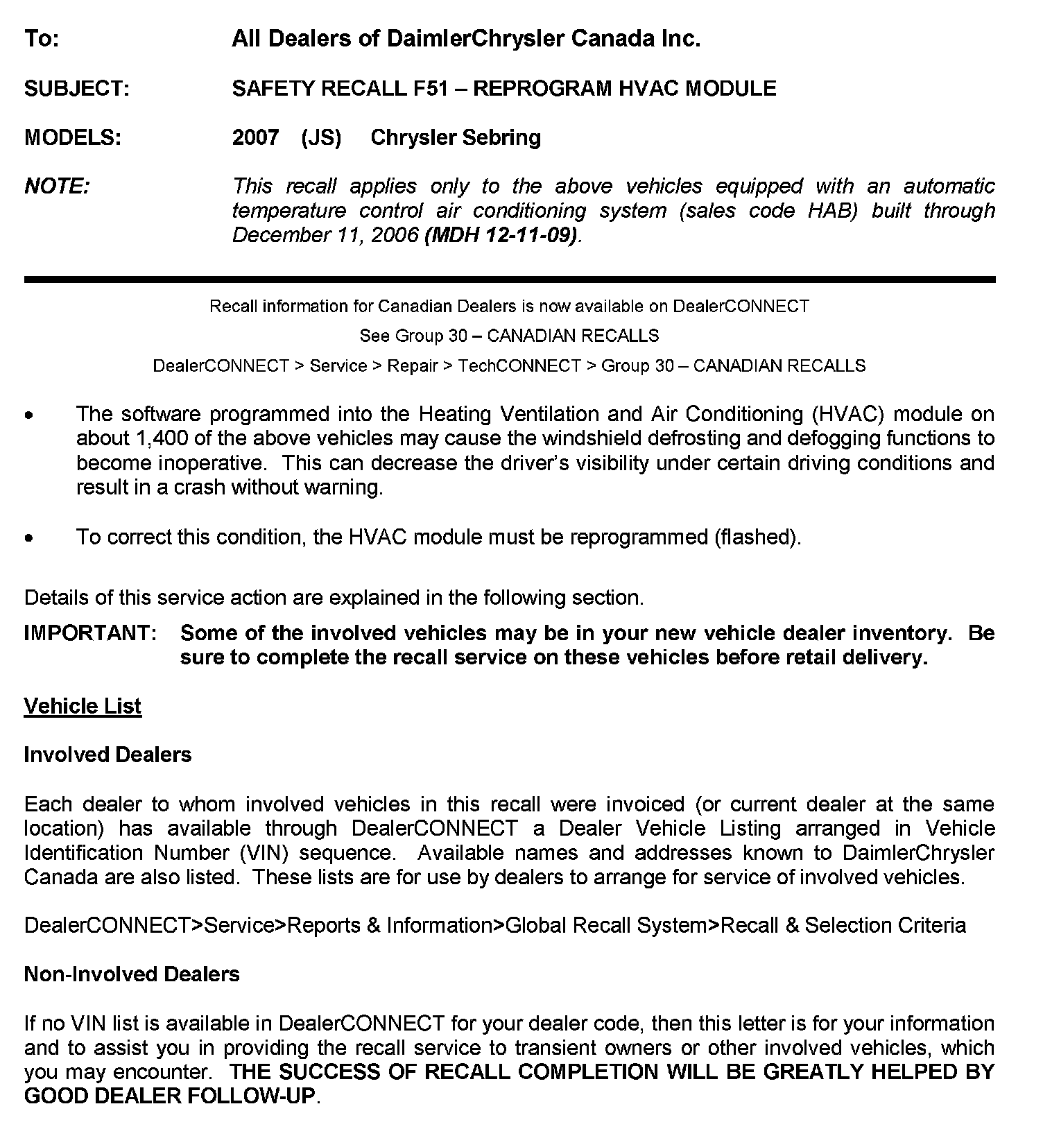 Home >> Chrysler >> 2007 >> Sebring Sedan L4-2.4L >> Repair and Diagnosis >> Heating and Air Conditioning >> Control Module HVAC >> Technical Service Bulletins >> Recalls >> Canada - Recall - F51 Reprogram A/C Module