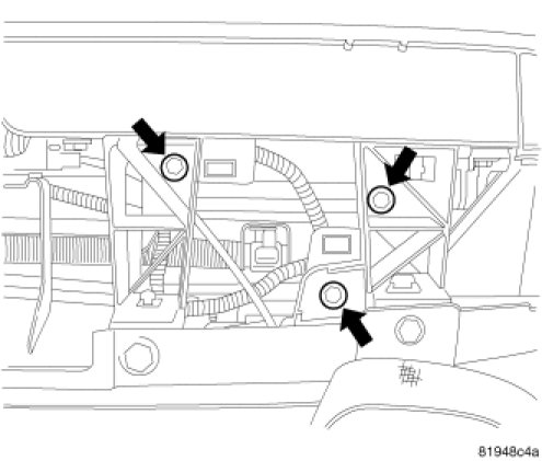 CAUTION: The hood release cable must be routed under the bracket assembly. Failure to route the hood release cable properly may pinch the cable and make the hood release inoperable This may cause damage to the release mechanism and/or cable.