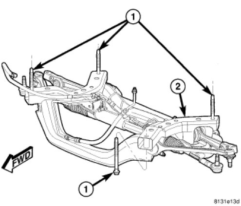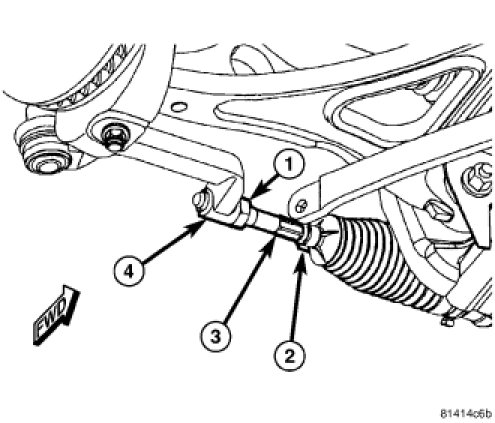 CAUTION: When installing an adjustment bolt, be sure to install it in the correct direction. Lower control arm bolts must be installed from the rear-forward to avoid contact with the stabilizer bar upon installation. Tension strut bolts must be installed from the front-rearward.