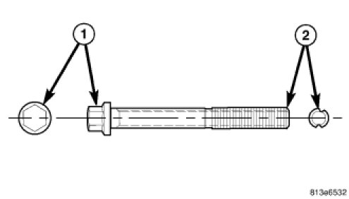 The adjustment bolt package contains 2 special bolts (1). These bolts can be identified by the offset grooves cut into the thread section (2). These bolts are designed to replace the inboard mounting bolts of the lower control arm and tension strut. Each bolt allows approximately 0.3 degrees of movement. To adjust camber only, use both bolts, one at the tension strut and the other at the lower control arm. To adjust caster only, use one bolt at the tension strut only.