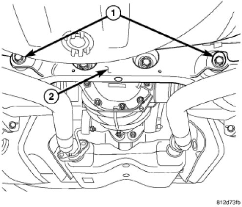 CAUTION: Wheel alignment adjustment bolts have offset grooves cut into the length of the bolt (2). If removing or installing lower control arm or tension strut mounting bolts that have these grooves, DO NOT ROTATE THE BOLT. To remove the bolt, hold the bolt head stationary and rotate the nut, then slide the bolt straight out of the bushing. This is necessary to avoid damaging the bat wings in the bushing inner metal or cradle.