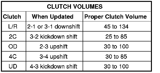 Certain mechanical problems within the input clutch assembly can cause inadequate or out-of-range element volumes. Also, defective Input/Output Speed Sensors and wiring can cause these conditions. The following chart identifies the appropriate clutch volumes and when they are monitored/updated: