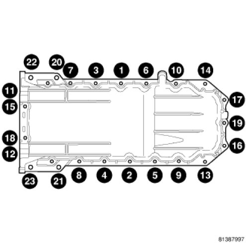 - Using the following torque sequence, torque the M10 oil pan fasteners to 54 Nm (39 ft.lbs.).