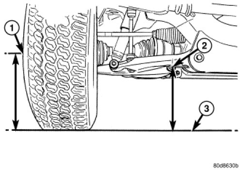 b. Center of the front face of bolt on the rear leg of Lower control arm (2) to ground vertical distance (3).