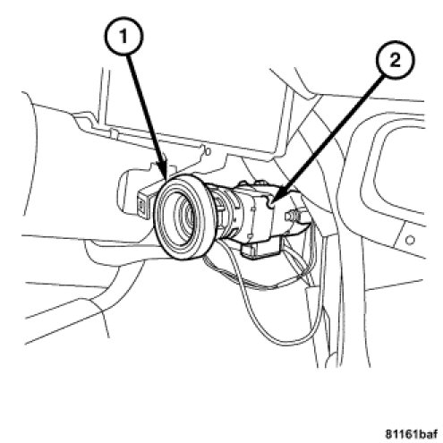 1. Install the sentry key antenna ring (1) to the ignition switch key cylinder (2).
