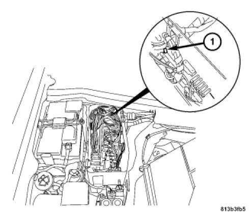 3. Holding the metal powertrain control module retaining clip (1) back, pull the powertrain control module up and out of the control module box.