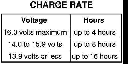 3. Battery chargers vary in the amount of voltage and current they provide. The amount of time required for a battery to accept measurable charging current at various voltages is shown in the Charge Rate Table. If the charging current is still not measurable at the end of the charging time, the battery is faulty and must be replaced. If the charging current is measurable during the charging time, the battery may be good and the charging should be completed in the normal manner.